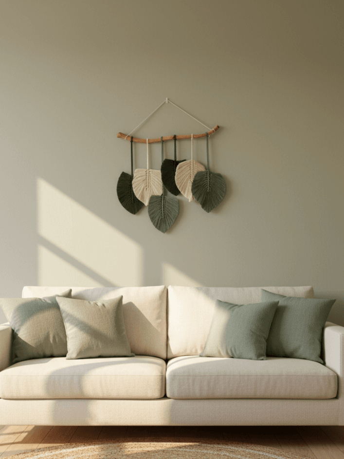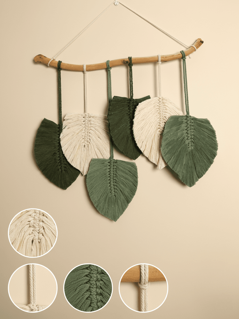 Unique Design: Features 6 macramé leaves (cream, olive, and green) tied to a natural wooden branch for a rustic finish.