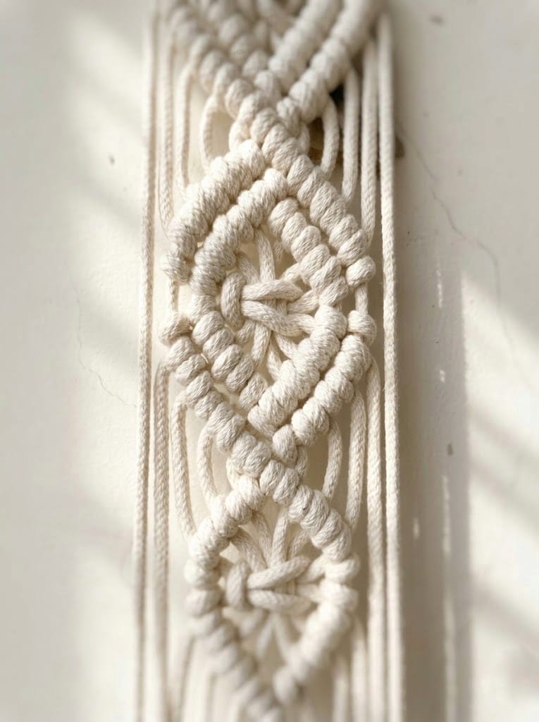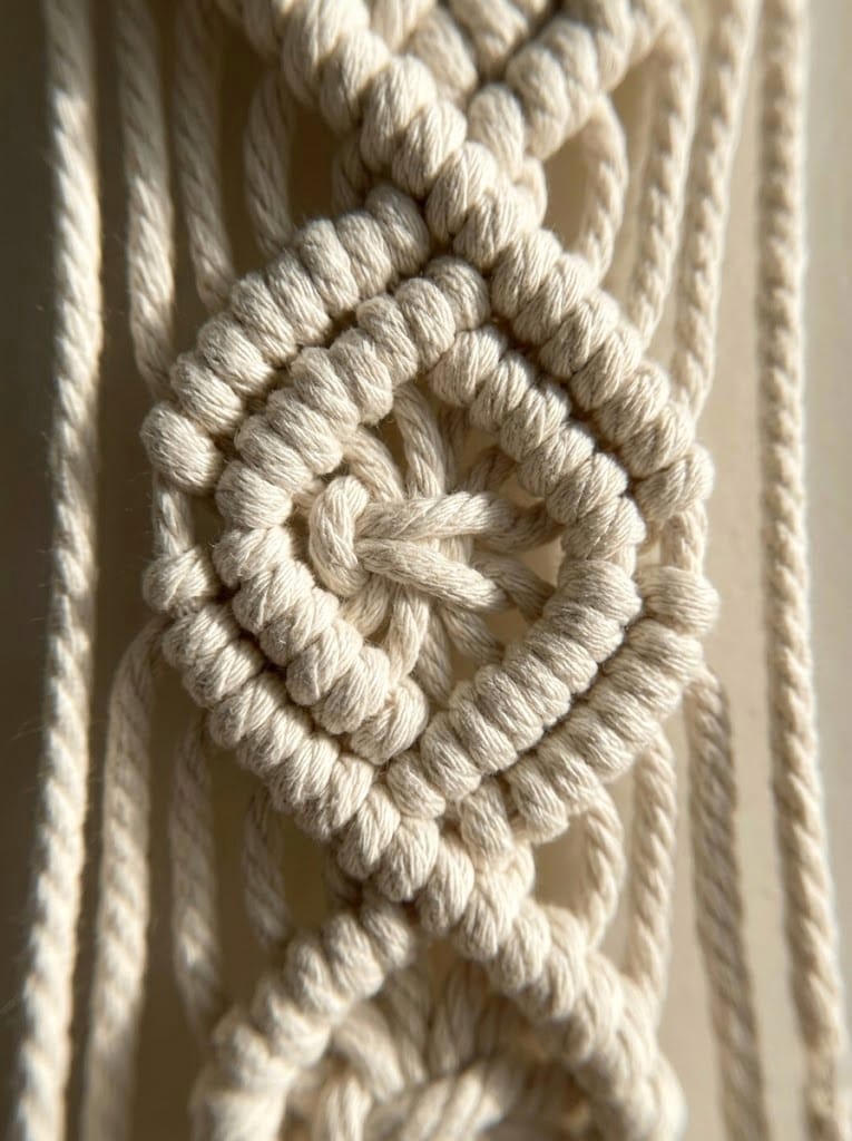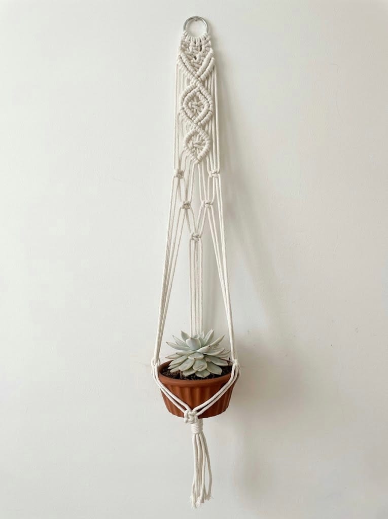 This long handmade macrame plant hanger features a diamond knot pattern and soft cotton cords. Perfect for adding calm and charm to any room.