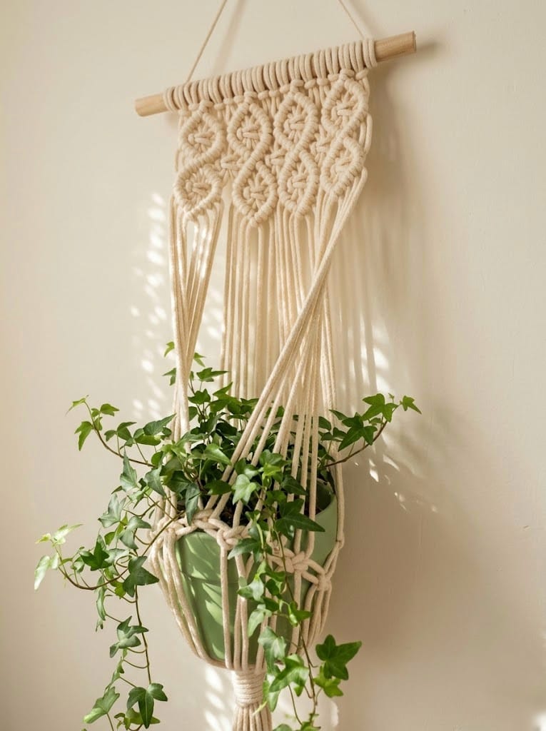 Handmade macrame plant hanger made from 100% cotton, perfect for adding boho charm while saving space. Fits various plant pots and ideal for home decor or gifts.