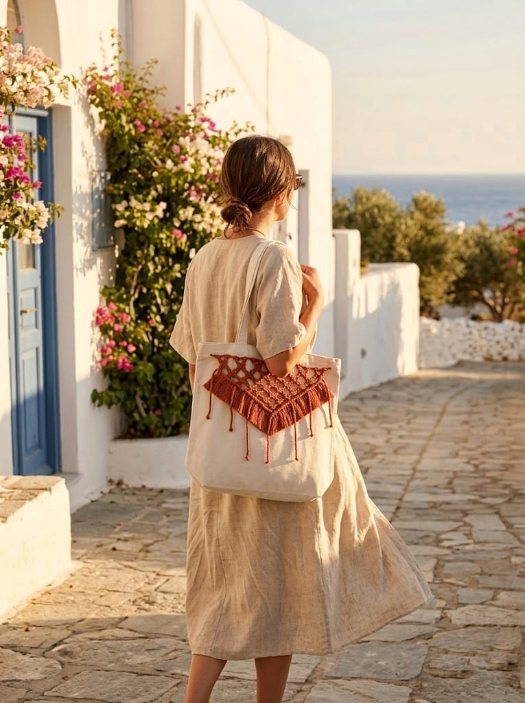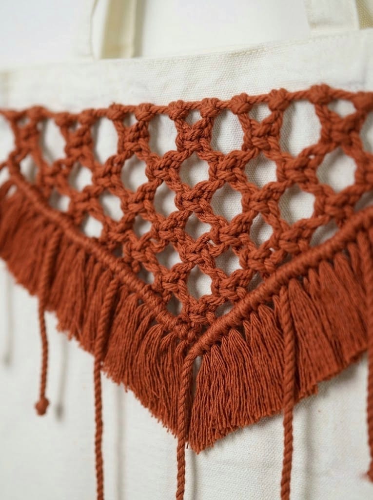 Design style: A triangular macrame pattern with open knot details and soft fringe, creating a relaxed boho statement on a minimalist tote bag.